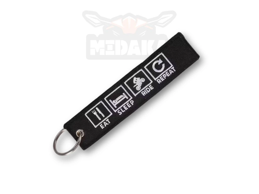 Stylová vyšívaná klíčenka s motivem Eat Sleep Ride Repeat pro každého motorkáře. Odolný textilní přívěsek na klíče, ideální dárek pro milovníky motorek.
